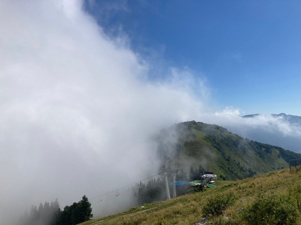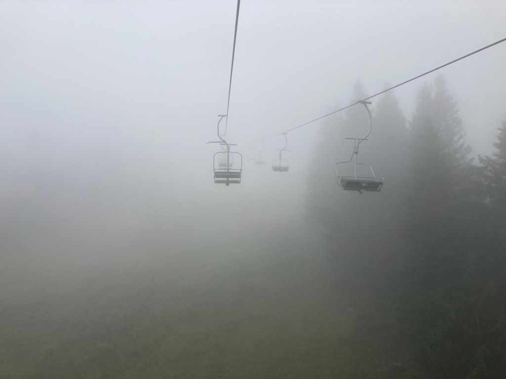 Nach der Übernachtung im Gästehaus Brunarica auf dem Pass Soriska Planina startet der Tag neblig. Direkt neben dem Gästehaus startet die Sesselbahn auf den Lajnar. Wir sind positiv eingestellt und nehmen die Bergfahrt in Angriff.