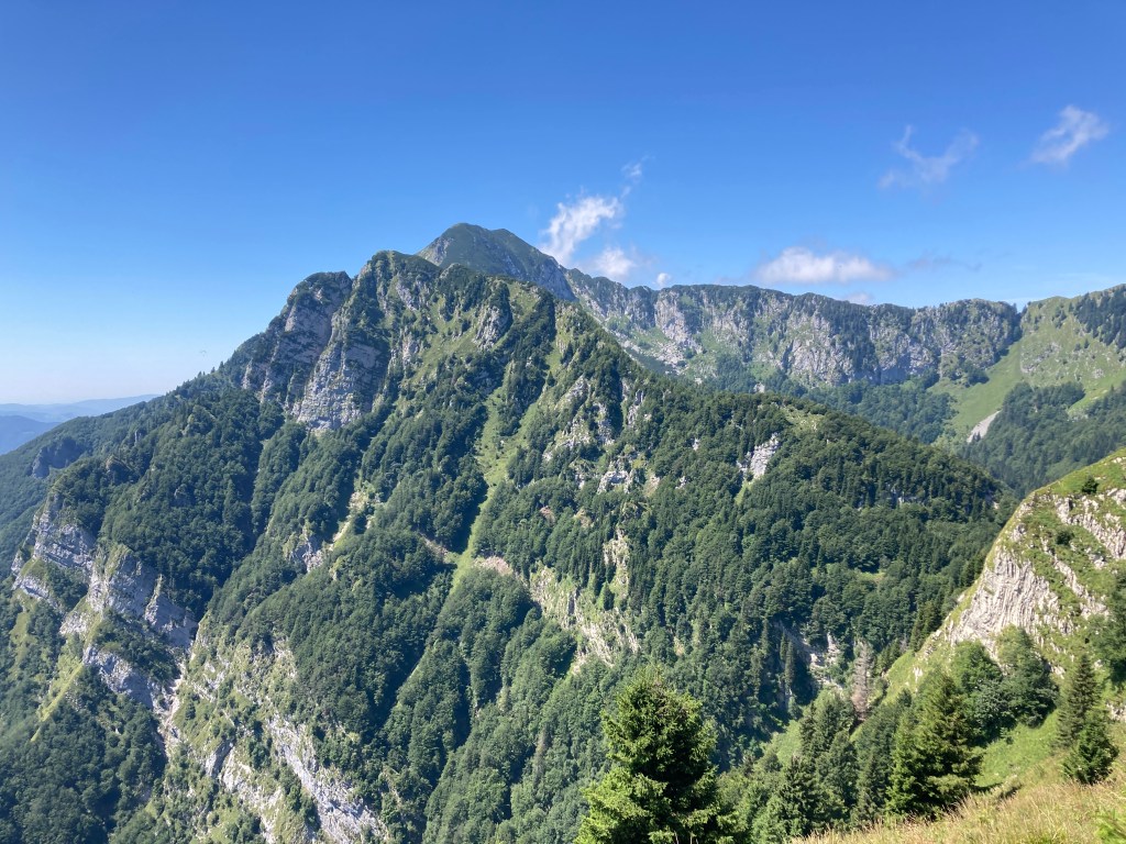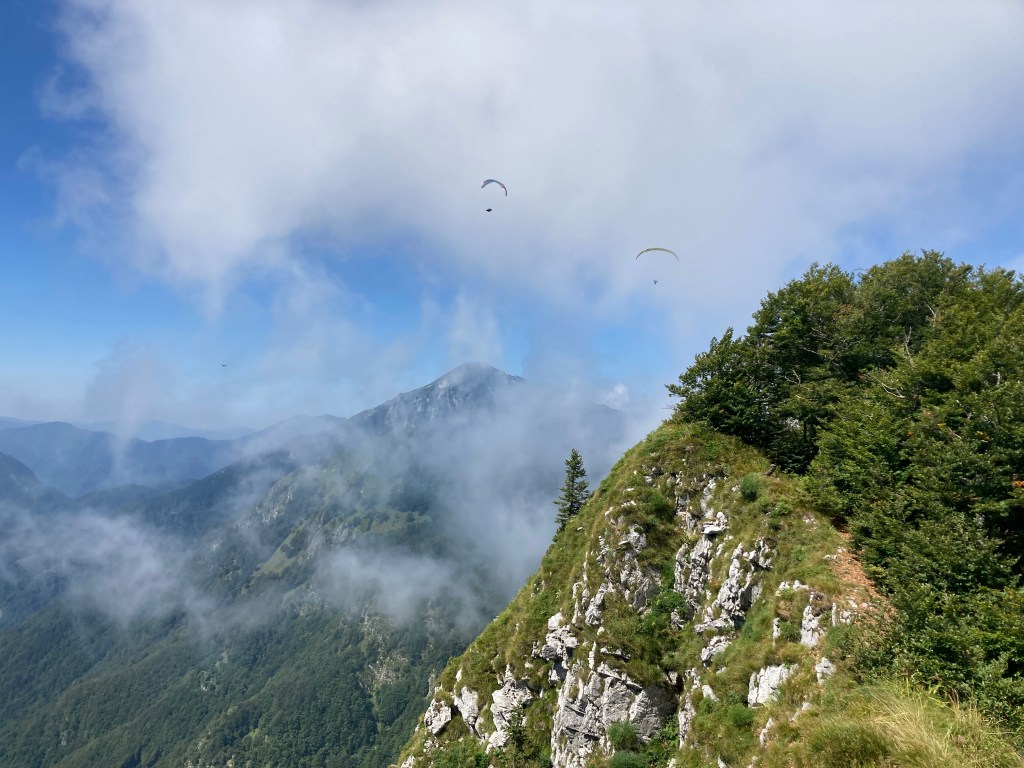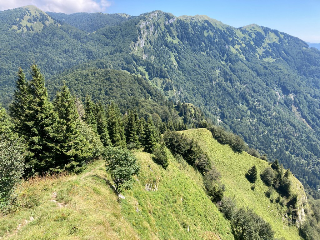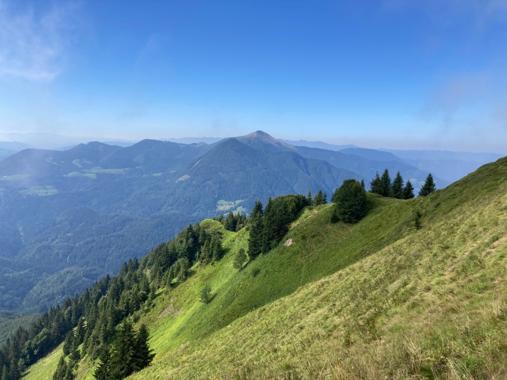 Vom Slatnik geht’s hinunter auf den Pass Vrh Bace (1273m). Mittlerweile sticht die Sonne auf uns herunter und wir sind froh über die schattenspendenden Bäume. Via Sance (1350m) geht’s hinauf auf den Kobla (1498m). Dabei geht’s entlang von steil abfallenden Weidehängen.
