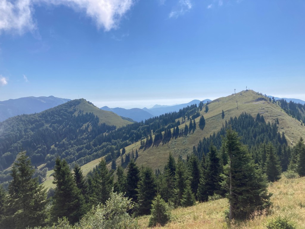 Vom Krevl streben wir den gegenüberliegenden Grat für den Abstieg an. Allerdings gibt es kein Durchkommen. Unterwegs finden wir noch einen stillgelegten Sessellift. Wir steigen auf einer frisch gemähten ehemaligen Skipiste ab, um anschliessend den letzten Aufstieg – wiederum auf den Pass Vrh Bace – unter die Füsse zu nehmen. Den Rückweg zur Unterkunft verläuft mehr oder weniger entlang der Höhenlinie auf einer Forststrasse.