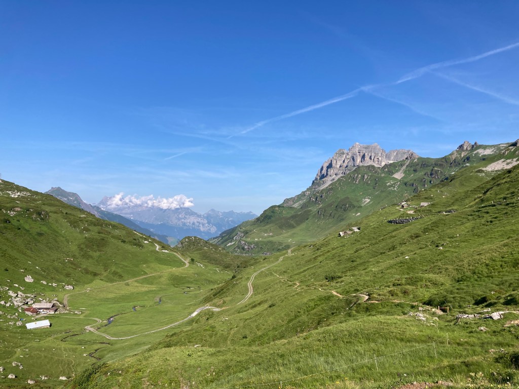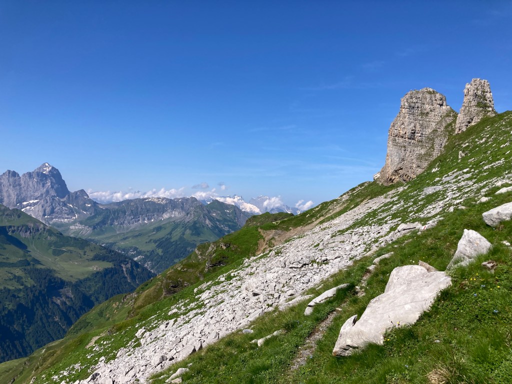 Bei der Alp Heidmannegg bin ich wieder zurück auf dem Höhenweg Schächental. Von hier sieht man hinauf an die Heidmanegger Chöpf und die Läged Windgällen.