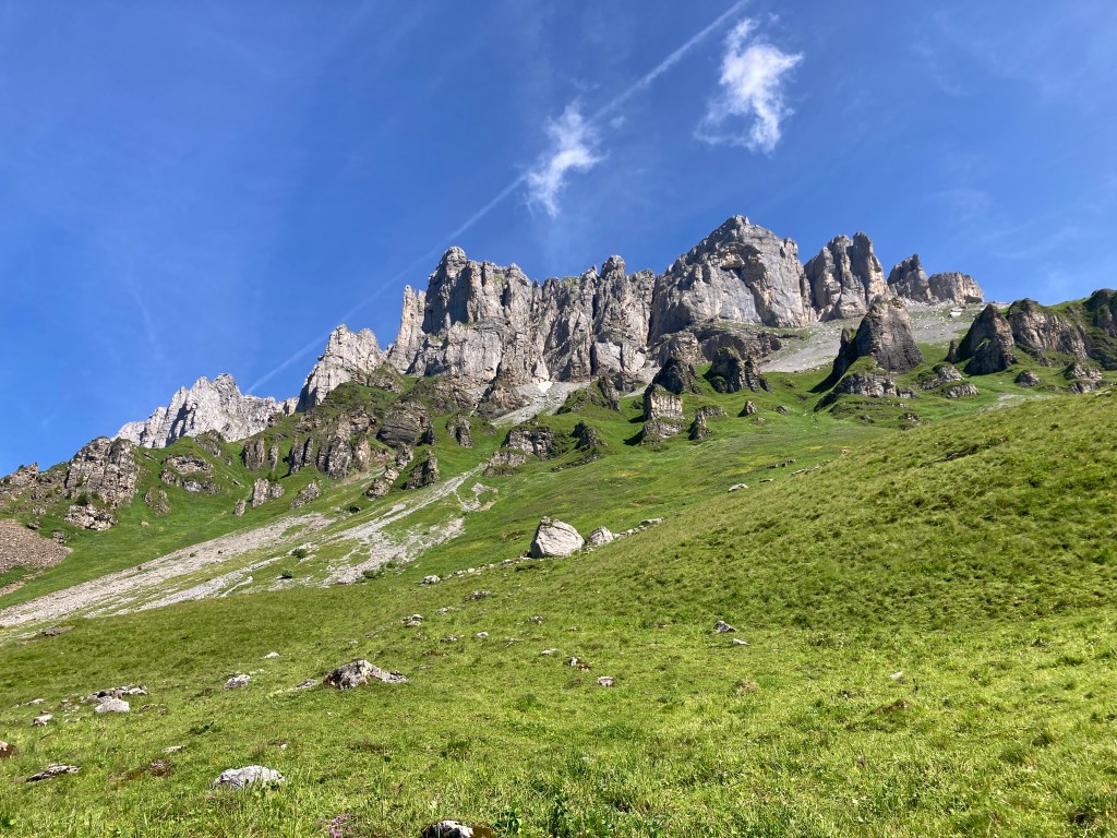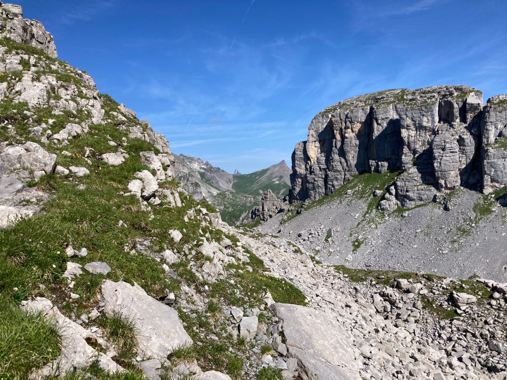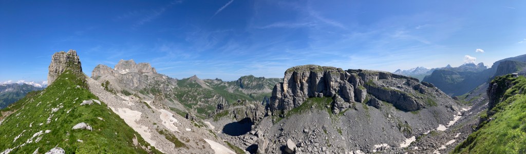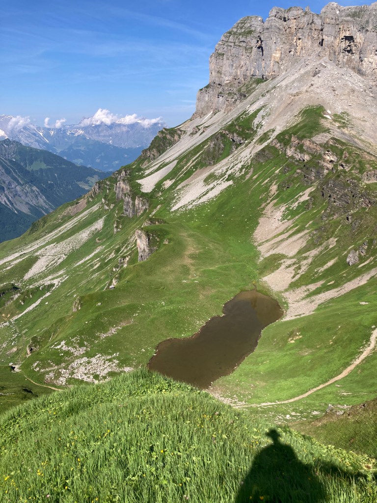 Frühmorgens kurz nach 6 Uhr gehts mit dem Zug via Arth-Goldau nach Altdorf, wo ich kurz nach 7 Uhr ankomme. Etwa eine halbe Stunde gilt es auf den Bus zu warten, der mich auf den Klausenpass hinaufbringt. Nicht nur mich – der Bus ist prallvoll mit motivierten Wander- und Kletterbegeisterten. Die Fahrt ist aufgrund der immer steiler werdenden Abhänge direkt neben der Strasse imposant. Nach über einer Stunde Busfahrt freue ich mich auf den Ausstieg und den Abmarsch um ca. 9 Uhr. Zuerst geht’s hinunter zum Hotel Klausenpass, wo der Weg am Hotel vorbei steil ansteigt hinauf aufs Balmer Grätli. Der bewusste Umweg (und das Abweichen von der Routen-Nr. 595) lohnt sich, da der Rundblick wunderbar ist. Der Weg führt mal etwas unterhalb des Grates, dann aber auch auf dem Grat Richtung talauswärts. Beim Ruosalper Chulm steigt dann der Weg wieder steil hinab, vorbei an einem kleinen See.