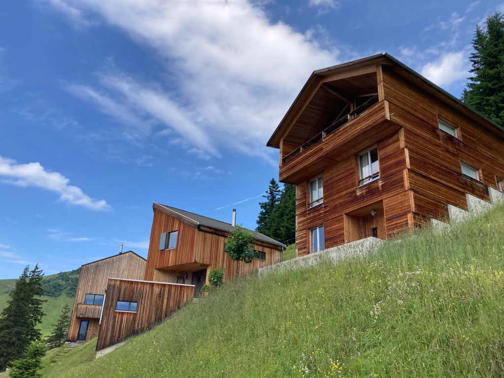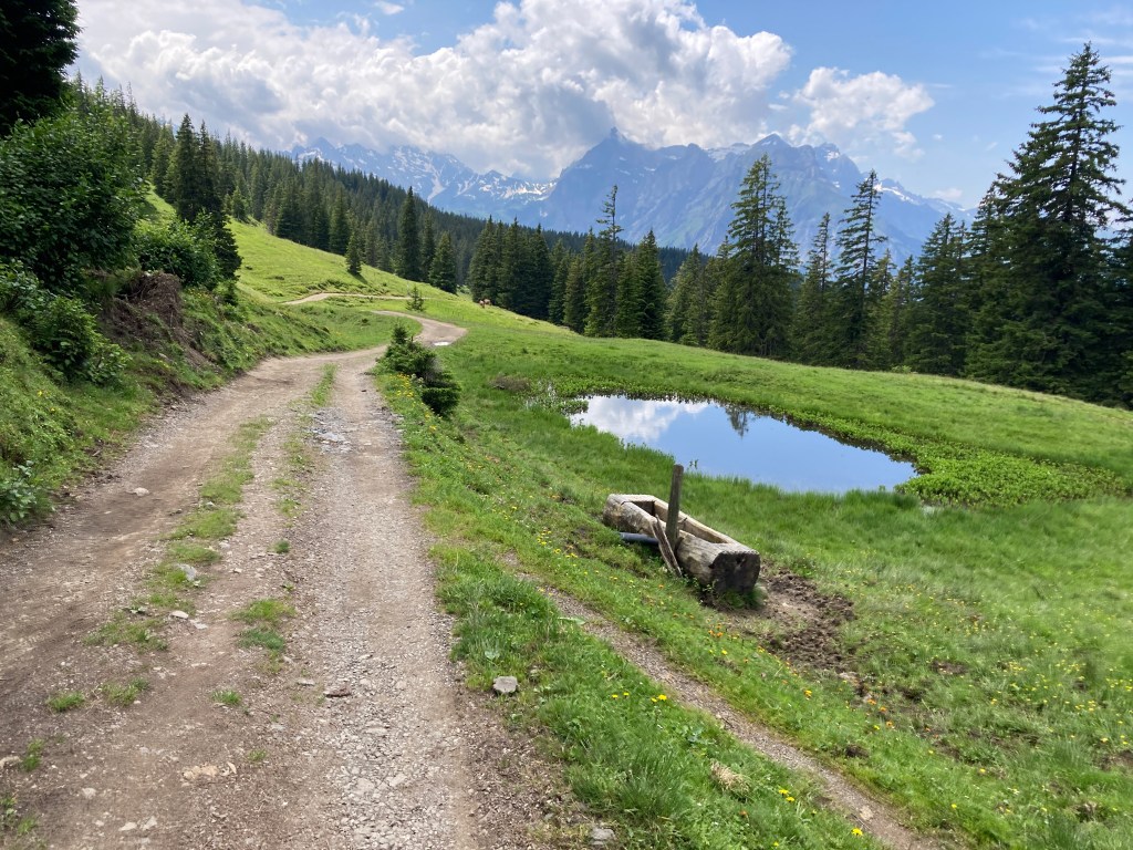 Von hier geht’s relativ auf den gleichen Höhenmetern talauswärts. Der Weg ist abwechslungsreich ausgestaltet: mal als Forststrasse, mal als Wanderweg, mal im Wald, mal an der Sonne. Praktisch entlang des ganzen Weges sind die Bergbauernfamilien fleissig dabei, das Heu zusammenzubringen. Bereits kurz nach dem Mittag ziehen die ersten grossen Wolken auf.