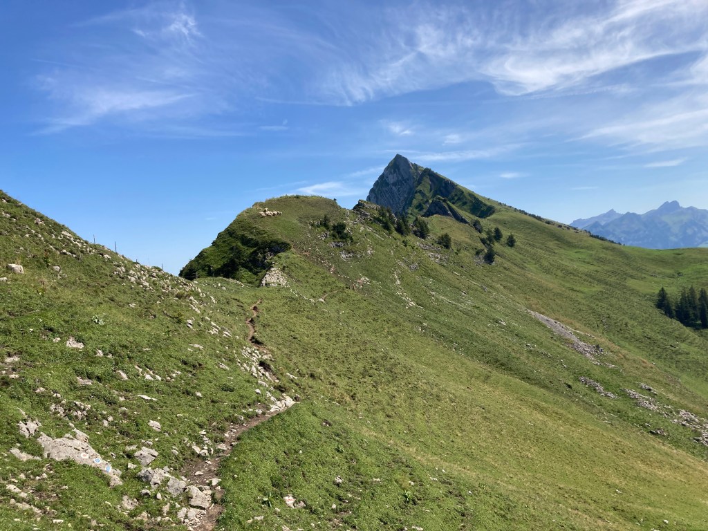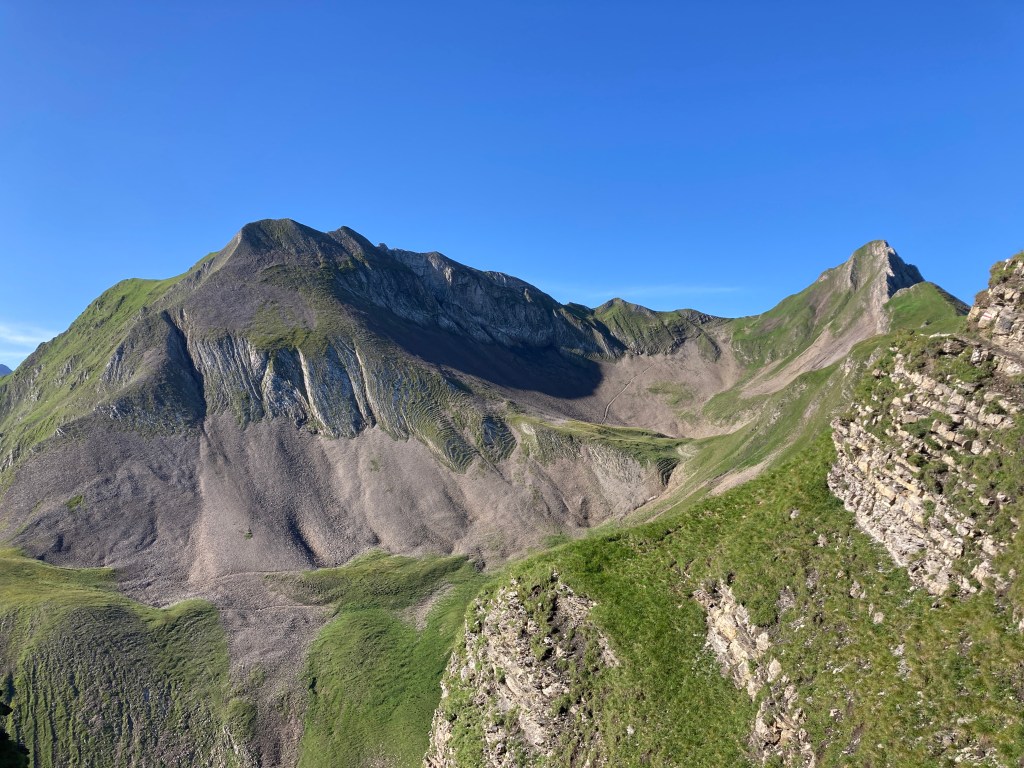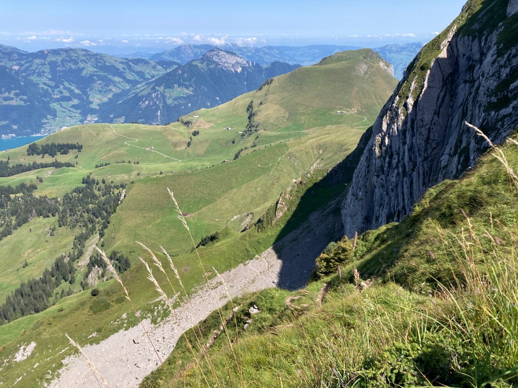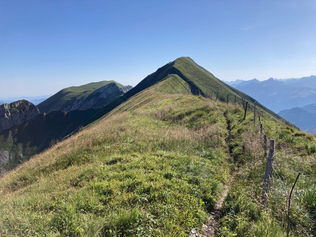 Nun sind die meisten Höhenmeter für den Moment geschafft und es geht über den Grat hinüber auf den Risetenstock. Von hier sieht man nun den Vierwaldstättersee schöner und natürlich auf den Schwalmis sowie den weiteren Verlauf des Grates (nach einer Unterbrechung durch das hintere und vordere Jochli). Vom „Vorder Jochli“ geht’s hinauf auf den wenig höher gelegenen Jochlistock. Von hier führt der alpine Wanderweg dem Grat entlang auf den Gandispitz.