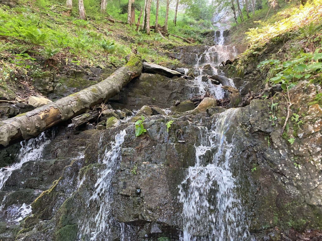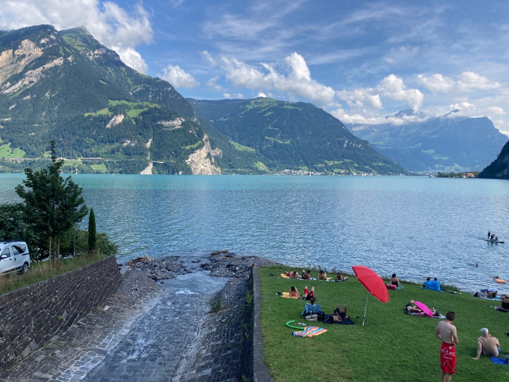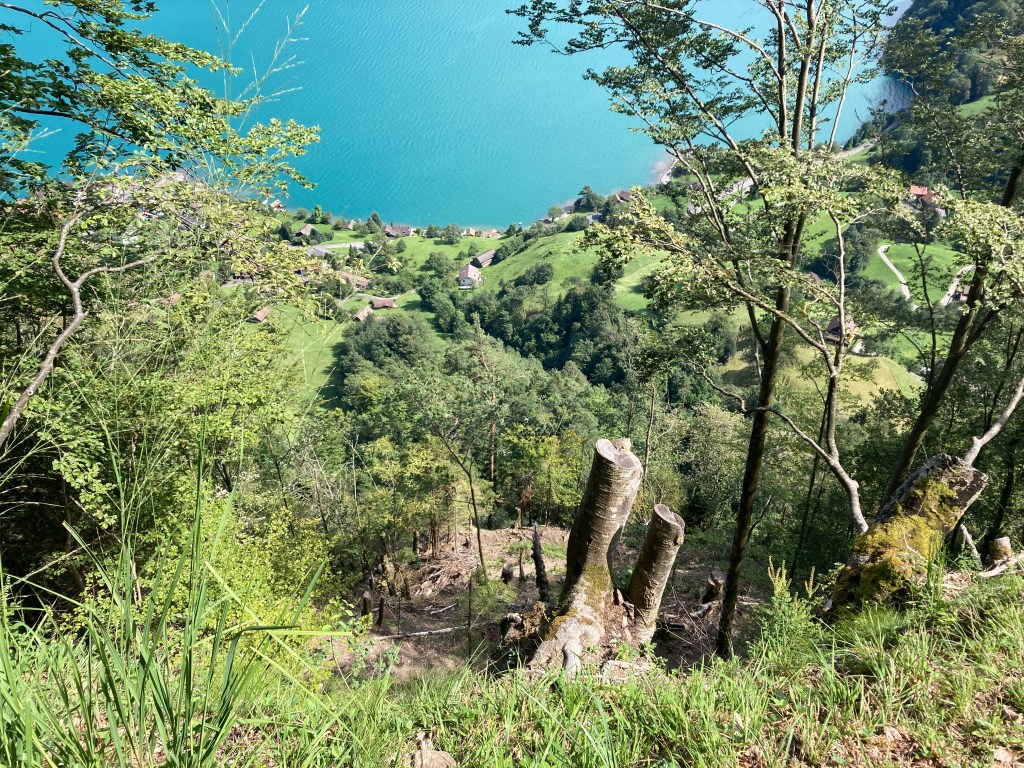 Der nun folgende Abstieg nach Bauen hat es in sich. Von 1600m.ü.M. geht es steil auf etwas mehr als 400m.ü.M hinab. Es scheint, dass dieser Weg nicht allzu oft begangen wird, was nicht weiter verwundert. Weder fürs hinauf noch fürs hinab ist das angenehm. Der Wanderweg ist gut gepflegt, aber der Regen der letzten Tage ist spürbar. Schön ist das ständige Rauschen, das einem von den kleinen Bächen praktisch auf dem ganzen Weg hinunter begleitet. Nach einer gefühlten Ewigkeit ist die Badi von Bauen erkennbar, dennoch braucht es noch viele Schritte hinunter ins kühle Nass des Urnersees.
