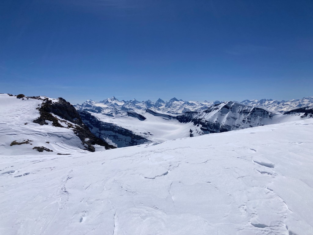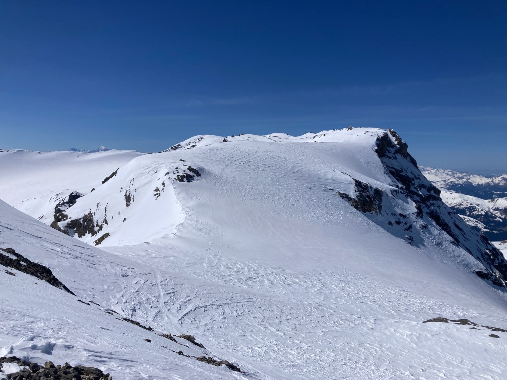 Frühmorgens machten wir uns zu fünft auf den Weg. Mit Start aus der Lagerhütte auf der Engstligenhalp gings zuerst oben an den Skilift. Damit konnten die ersten Höhenmeter bequem absolviert werden. Wir zogen die Felle auf und stiegen nun Schritt für Schritt empor. Die Schlüsselstelle beim Früestücksplatz brauchte etwas Vorbereitung und Überwindung. Danach erfolgt der Aufstieg über den Ammertegletscher.
